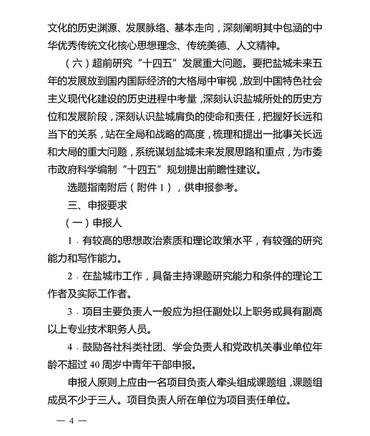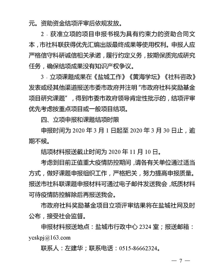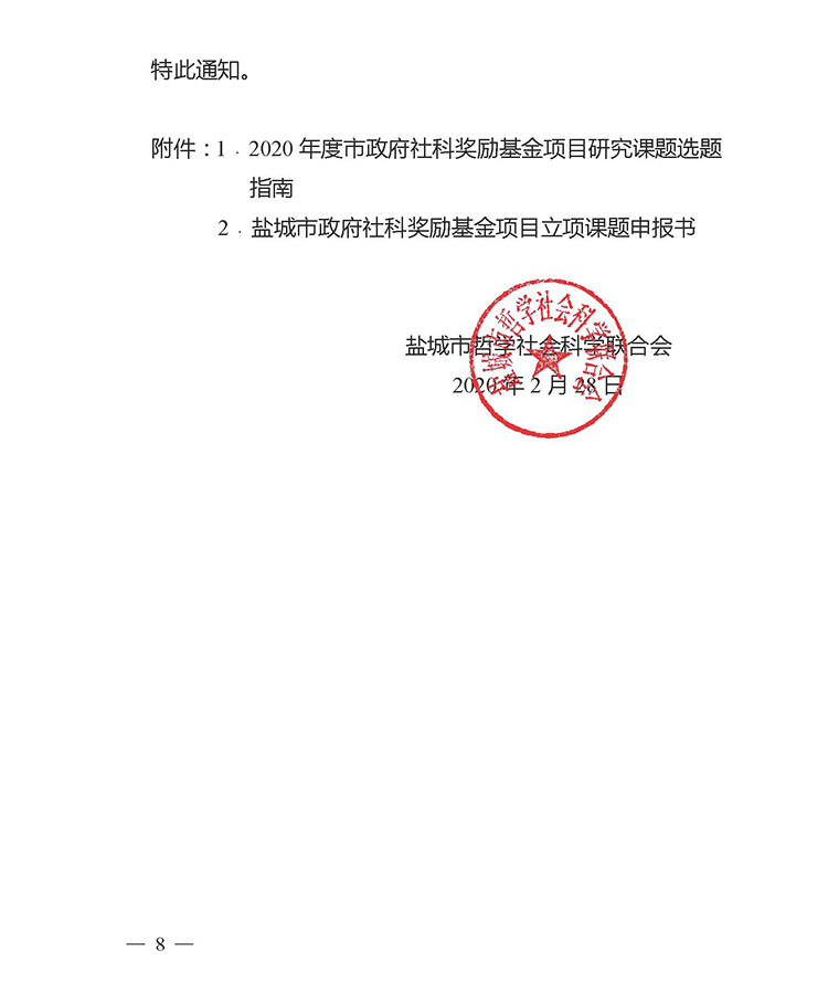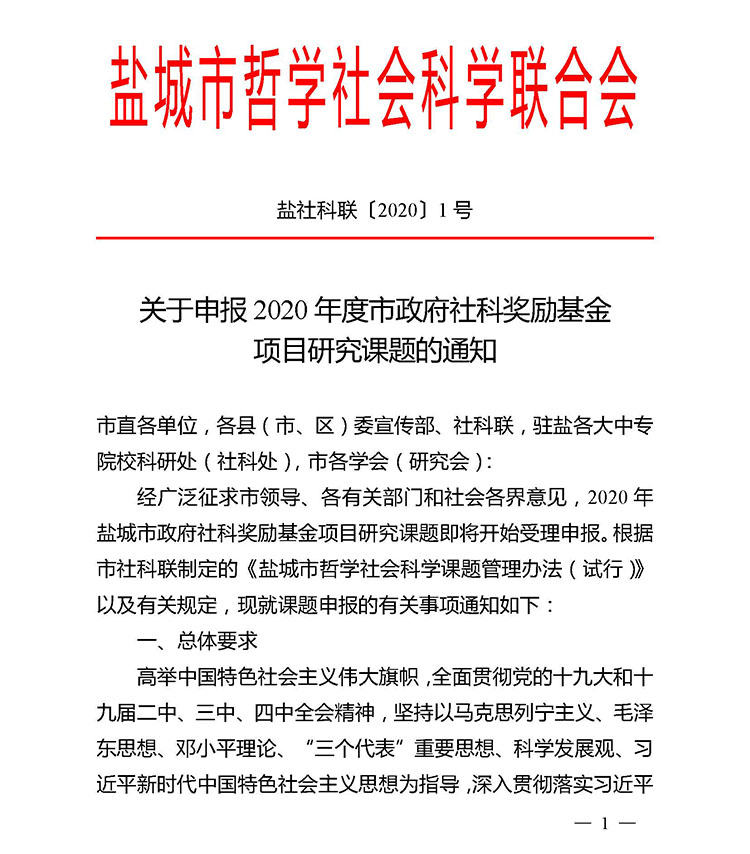 2020年度盐城市社科基金项目申报工作已开始,请各学院、部门按要求组织项目申报人认真填写《申报书》,并对申报人的申报资格和填报内容进行初审,经学院初审后,按照所在学院副高级职称人数15%确定推荐参评项目数量,并于2020年3月23日前将申报书(按照学院+申报人姓名+学科+课题名称命名)和《申报一览表》电子稿各1份发送科研处邮箱keyanchu415@163.com。