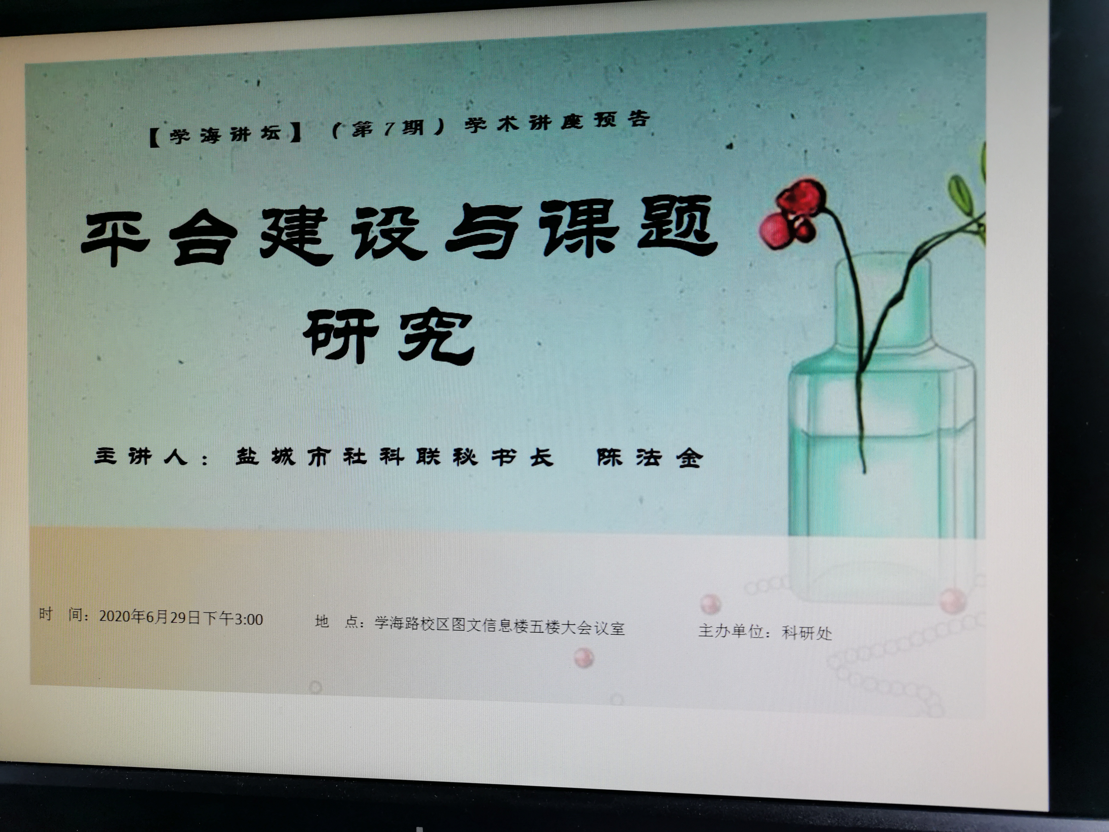 2020年6月29日下午,应我校科研处的邀请,盐城市社科联陈法金秘书长在我校学海路校区图文信息楼五楼大会议室,做了题为《平台建设与课题研究》的学术讲座。本次讲座由科研处处长周梅香主持,来自各二级学院分管科研工作的院长、校级科研平台负责人及成员和部分在研项目负责人参加了此次活动。