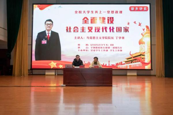 12月15日下午,受党委学生工作部邀请,我校马克思主义学院丁学领院长以《开启全面建设社会主义现代化国家新征程》为主题,在学海路校区行政楼三楼报告厅为全校大学生带来了一场精彩的专题讲座。讲座由党委学生工作部张彬部长主持。本次讲座采用线上线下相结合的方式,除报告厅现场近300名学生代表外,同时也向全校师生进行同步现场直播。