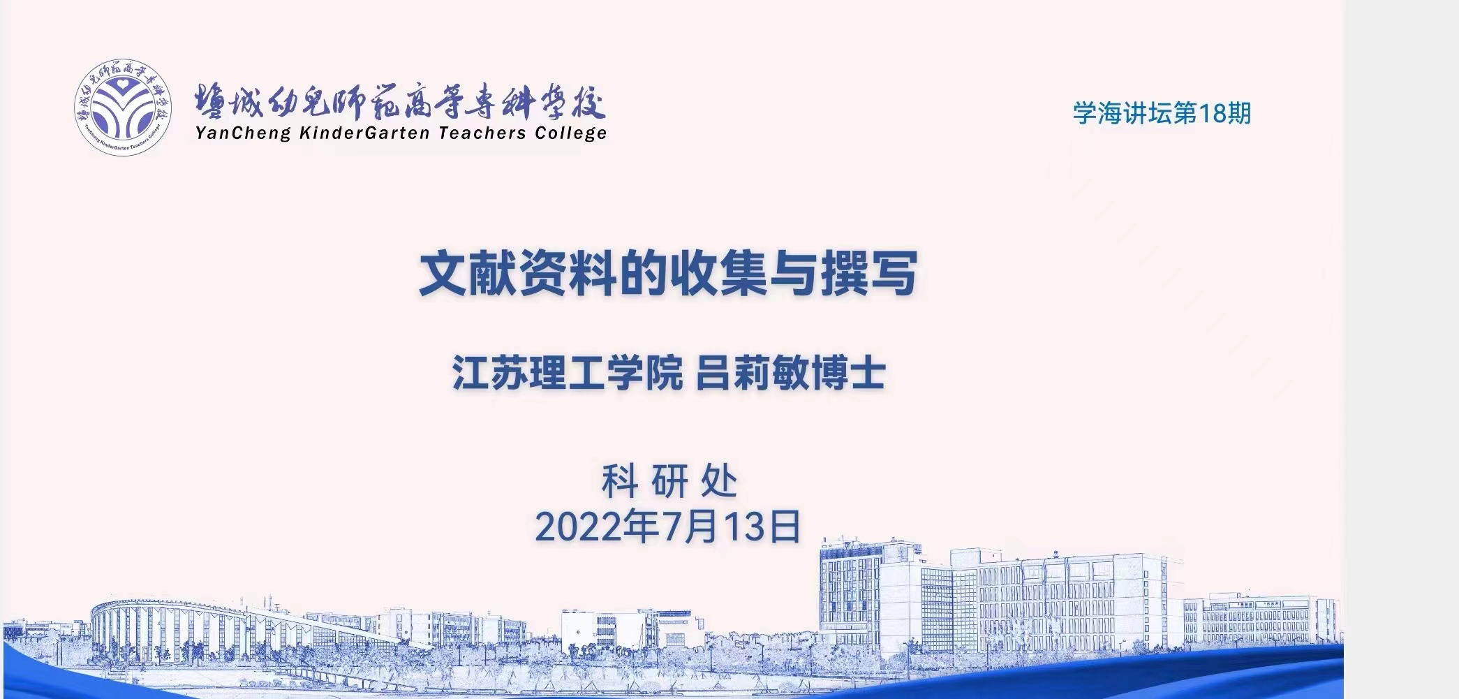 2022年7月13日,我校邀请江苏理工学院吕莉敏博士为教师开设讲座。重点指导文献资料的收集与撰写。活动采取视频会议的形式展开。讲座由科研处处长周梅香主持。“教师科研能力提升工程”首批培养对象、科研处人员以及对研究感兴趣的老师参加。