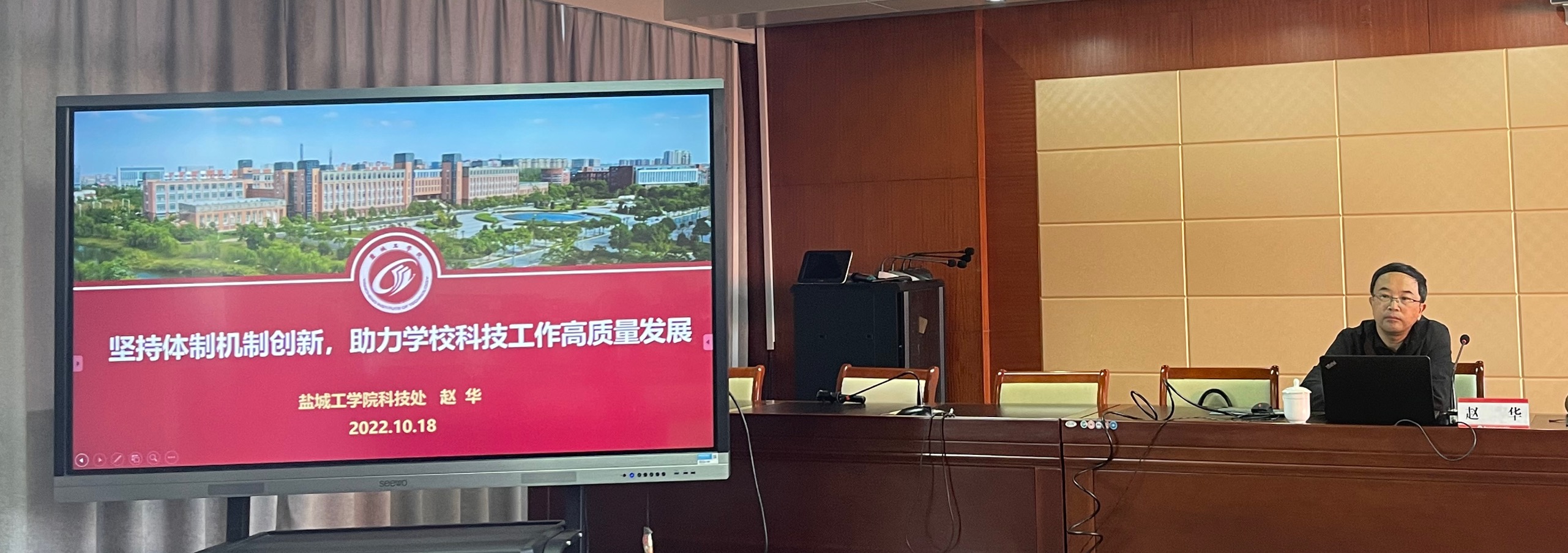 2022年10月18日下午,“学海讲坛”第20期活动,邀请了盐城工学院科技处副处长、赵华教授为教师开设讲座。讲座主题为“坚持体制机制创新 助力学校科技工作高质量发展”。讲座由科研处处长周梅香主持。各学院分管科研的院长、各学院科研秘书、各部门科研联络员、部分横向课题主持人及国家授权专利持有人参加了活动。