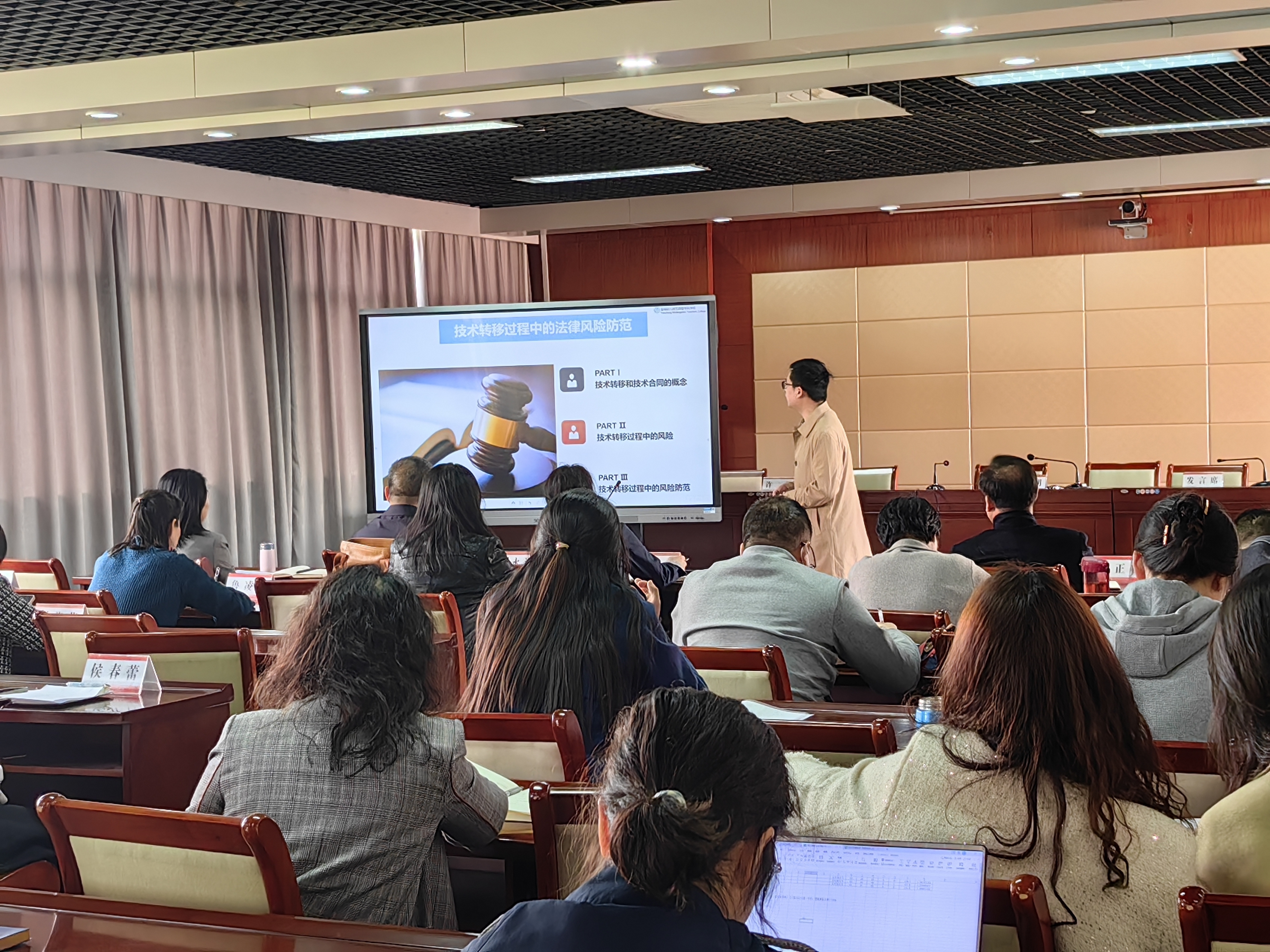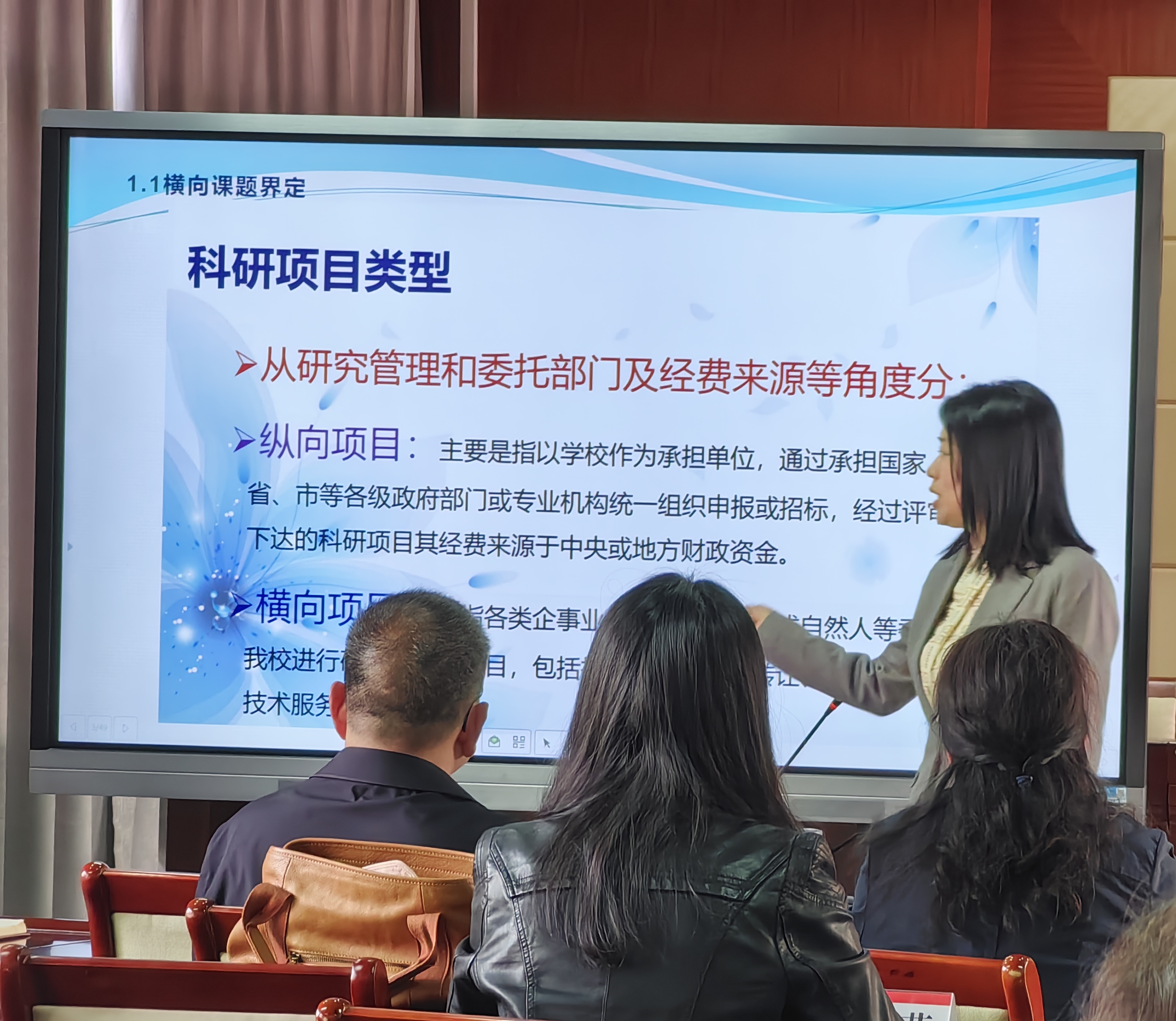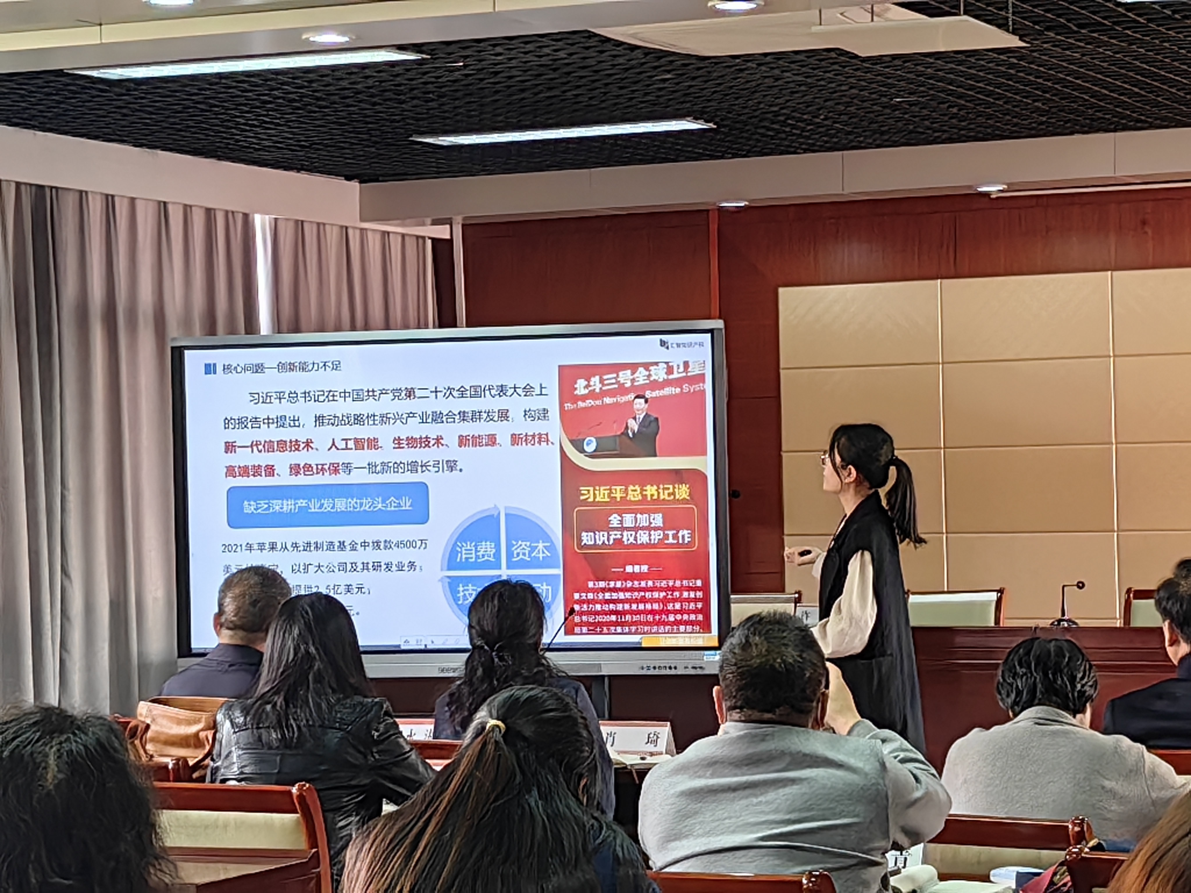 第二阶段是科技成果转化培训分享和科技服务个人心得分享。鲁迅艺术学院边梦清老师、建筑工程学院岳明宇老师、人文教育学院侯春蕾老师和学前教育学院一分院崔静文老师,分别汇报了国家技术转移人才培养基地2023年第一期技术经理人学习心得。接着,单春明处长做了《推进科技创新,提升科技服务能力》科技服务专题辅导,深入推进协同创新,共建市域、行业产教融合体,鼓励老师们主动调研行业企业需求。通过协同研究,将教书育人中的实践知识转化为课题研究,增强学术研究与教育教学的关联度,更好地服务教育教学。与会人听会认真,拍PPT照片,记笔记,学习氛围浓厚。