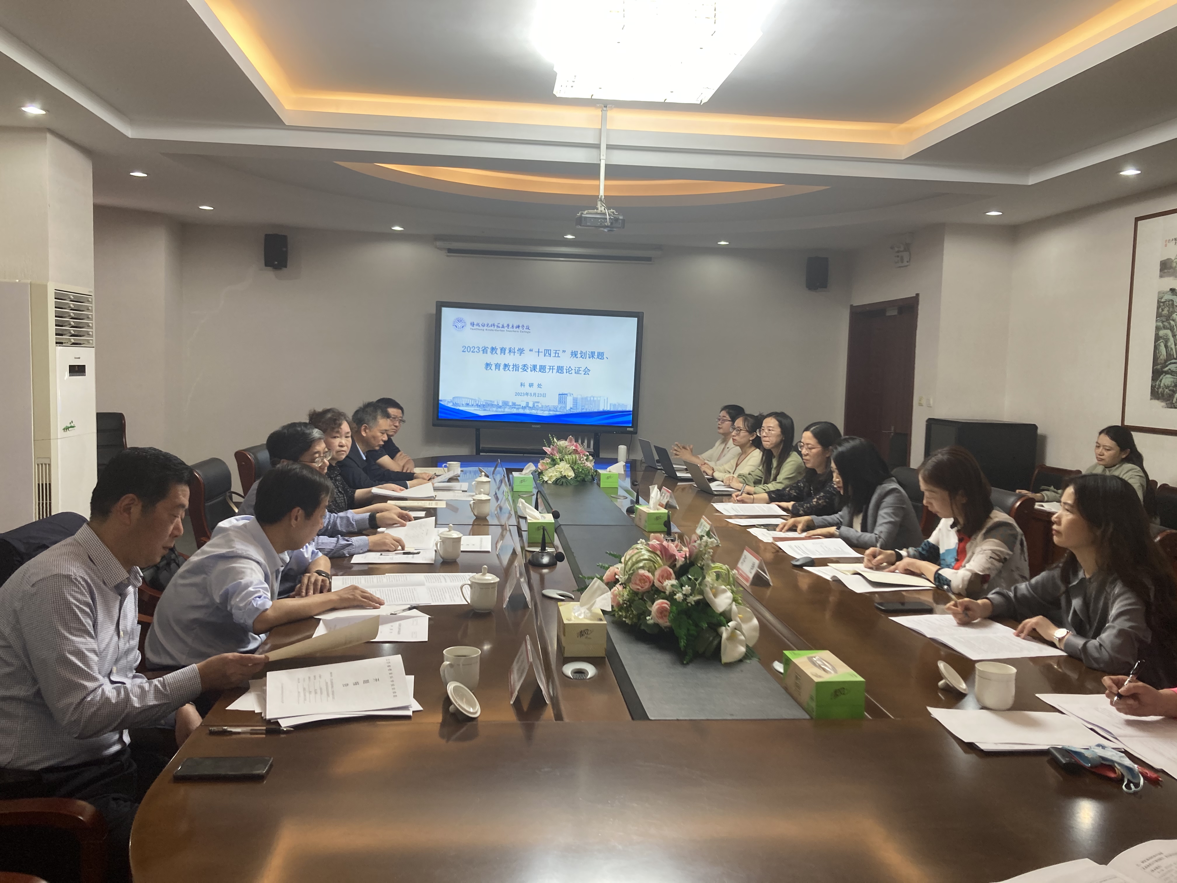 5月24日下午及晚上,我校在学海路校区图文信息楼五楼中会议室,举办2023年度省教育科学“十四五”规划课题、教育教指委课题开题评议会及2023年省社会科学基金项目申报指导会。盐城市社科联党组书记、主席李晓奇,盐城师范学院社科处处长乔晖教授,盐城工学院土木学院院长吴发红教授,盐城师范学院历史与公共管理学院档案学系主任卞咸杰教授,盐城市教教育科学研究院职业教育研究所原所长、高级教师郝清平以及盐城市职业教育工作联席会议办公室秘书长、高级教师秦凤龙担任评议专家。李晓奇主席担任专家组组长。科研处处长单春明主持活动。科研处副处长许艳、各课题组负责人及部分成员参加了活动。