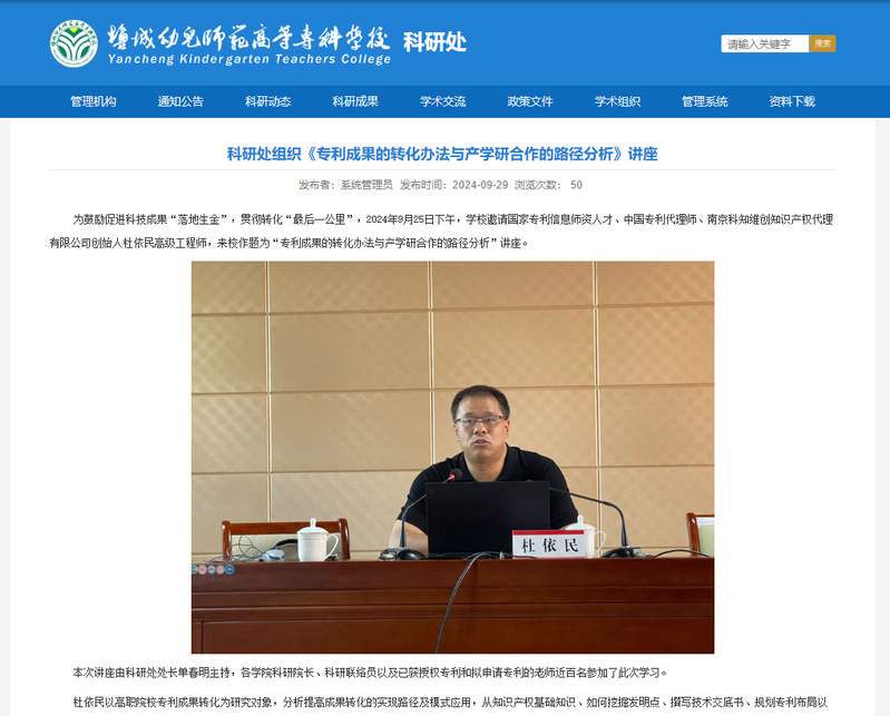 为进一步提升转化意识,2024年9月25日下午,学校邀请国家专利信息师资人才、中国专利代理师、南京科知维创知识产权代理有限公司创始人杜依民高级工程师,来校作题为“专利成果的转化办法与产学研合作的路径分析”讲座。各学院科研院长、科研联络员以及已获授权专利和拟申请专利的老师近百名参加了此次学习。