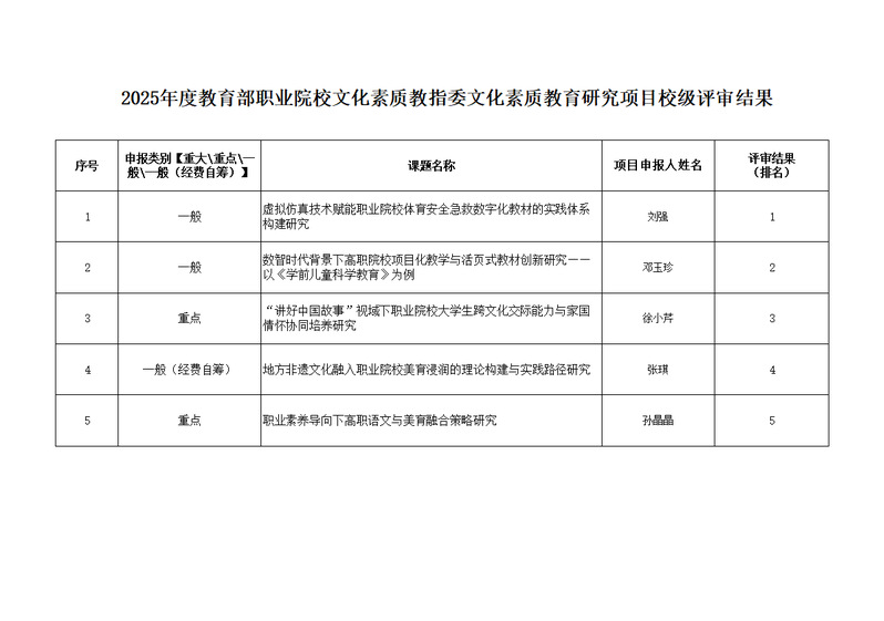 近日,根据《关于开展2025 年度文化素质教育研究项目申报工作的通知》精神,对我校6个申报项目进行了校级评审。经过资格审查与专家组评审,评审结果排名前5位的项目如下。特此予以公示。